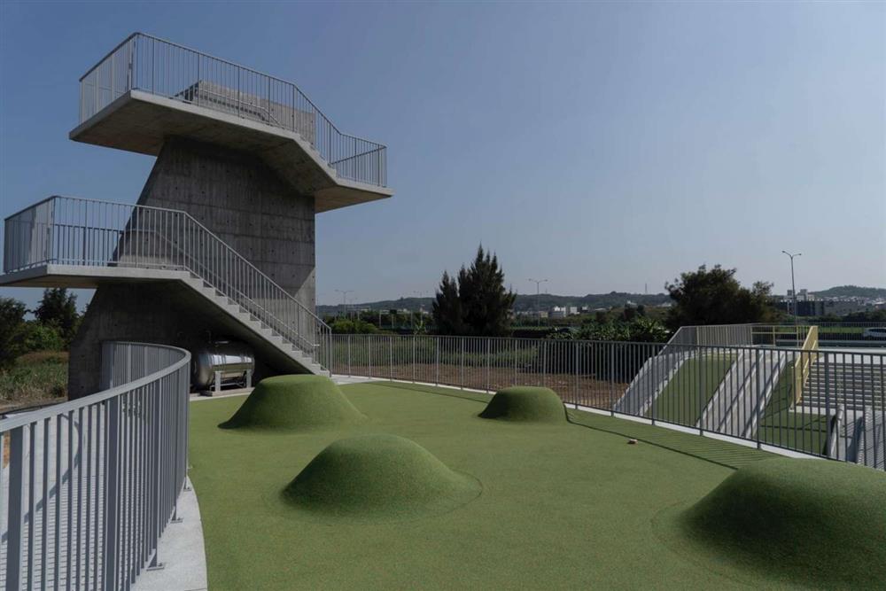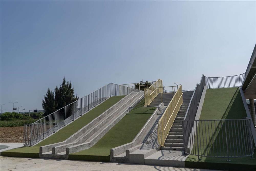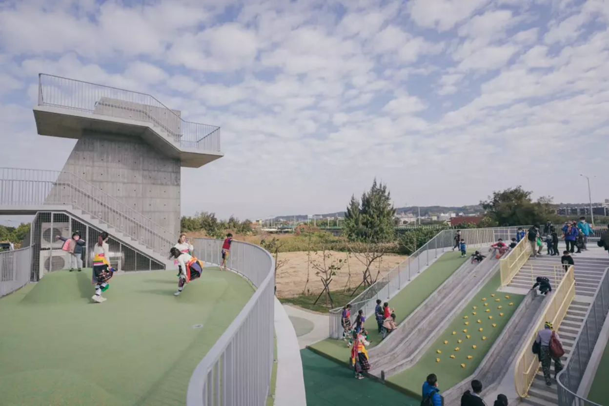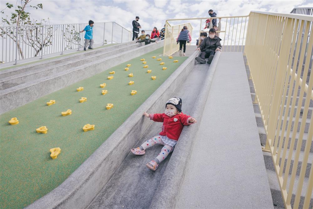 二樓以上:設計部落瞭望台、戶外大型溜滑梯、圓形廣場等,屋頂平台更有數座小綠色山丘,孩子可以在一二樓空間之間盡情奔跑,休憩時更可遠眺寬闊海岸線。